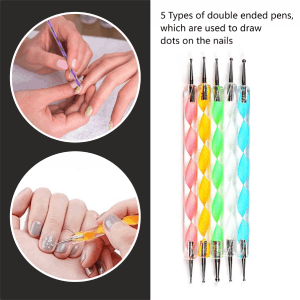100% brand new and high quality;5pcs nail art dotting tools with 2 ends each; One end with a larger ball and another end with a smaller ball for various dotting work.